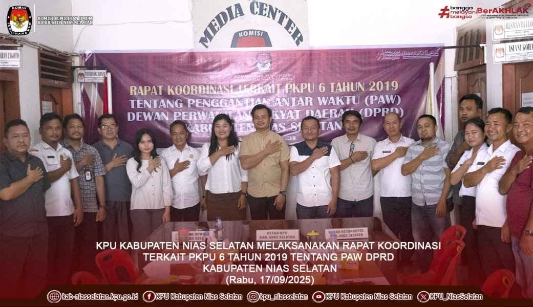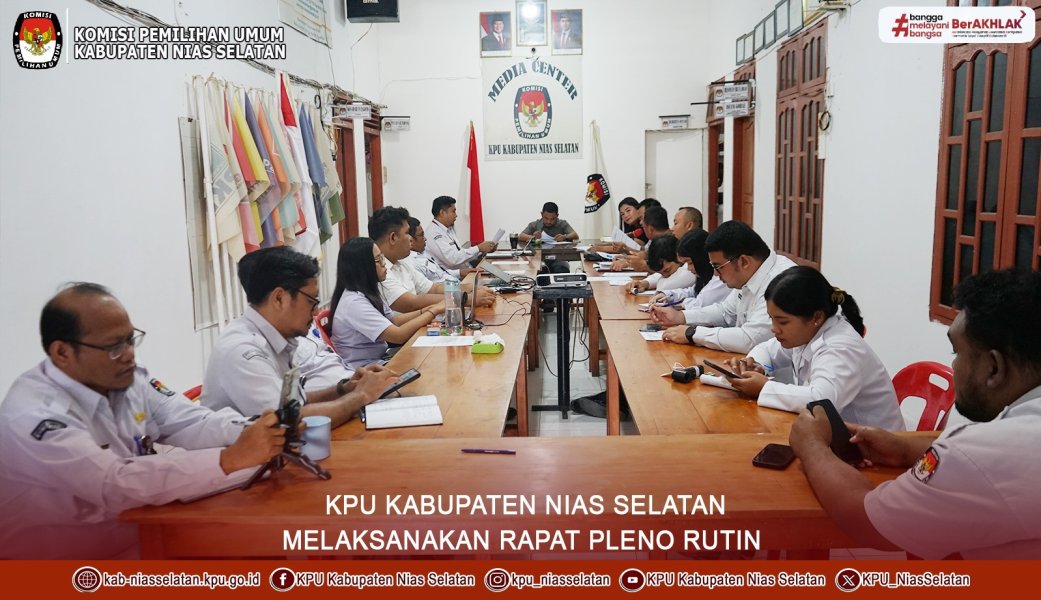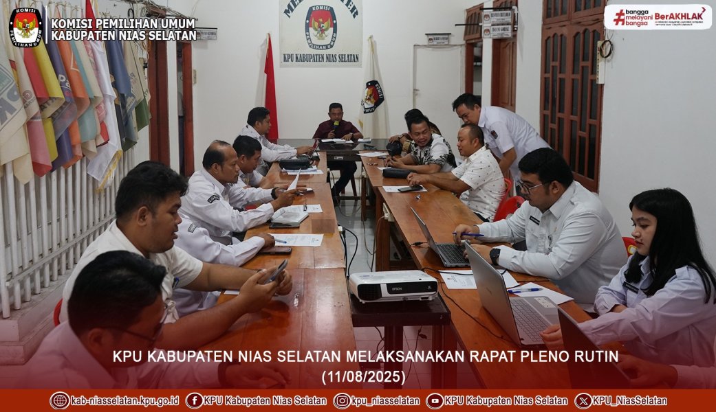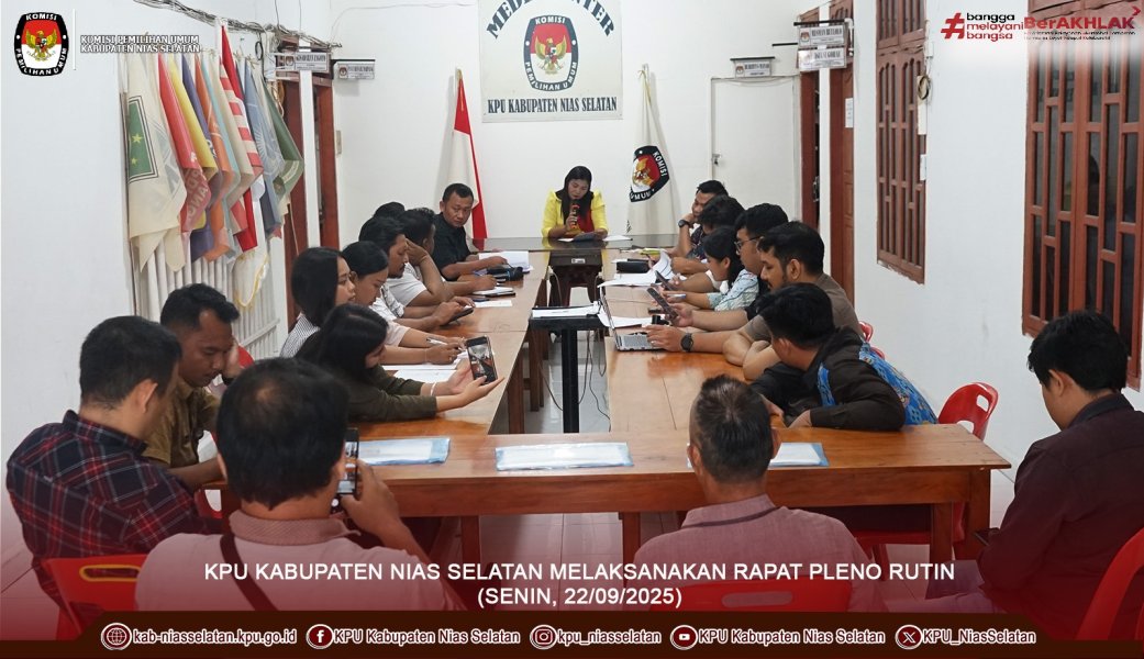 Teluk Dalam, kab-niasselatan.kpu.go.id - Komisi Pemilihan Umum (KPU) Kabupaten Nias Selatan melaksanakan Rapat Pleno Rutin bertempat di Aula Kantor KPU Kabupaten Nias Selatan, Senin (22/09/25). Isiani Gohae Anggota KPU Kabupaten Nias Selatan Divisi SDM dan Parmas memimpin Rapat Pleno Rutin yang dihadiri Anggota KPU Kabupaten Nias Selatan Resman Buulolo, Kadar Kristian Wau, Sifaomadodo Wau dan jajaran sekretariat KPU Kabupaten Nias Selatan. Rapat Pelno Rutin yang beragendakan Pembahasan Keputusan KPU Nomor 805 Tahun 2025 tentang Pencabutan atas Keputusan Komisi Pemilihan Umum Nomor 731 Tahun 2025 tentang Penetapan Dokumen Persyaratan Pasangan Calon Presiden dan Wakil Presiden sebagai Informasi Publik yang Dikecualikan Komisi Pemilihan Umum; Pembahasan Keputusan KPU Nomor 783 Tahun 2025 tentang Pedoman Pelaksanaan Kerja Lembur Bagi Pegawai Aparatur Sipil Negara, Pegawai Non-Aparatur Sipil Negara, Satuan Pengamanan, Pengemudi, Pramubakti, dan Petugas Kebersihan di Lingkungan Komisi Pemilihan Umum; Pembahasan Sistem Pengendalian Intern Pemerintah (SPIP) bulan Agustus; Pemutakhiran Daftar Pemilih Berkelanjutan (PDPB) Tahun 2025 triwulan ke III dan Hal lain yang dianggap perlu.