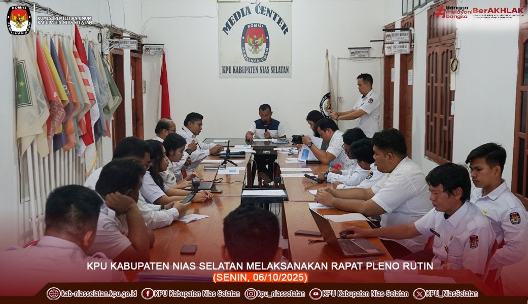 Komisi Pemilihan Umum (KPU) Kabupaten Nias Selatan melaksanakan Rapat Pleno Rutin bertempat di Aula Kantor KPU Kabupaten Nias Selatan, Senin (06/10/25).