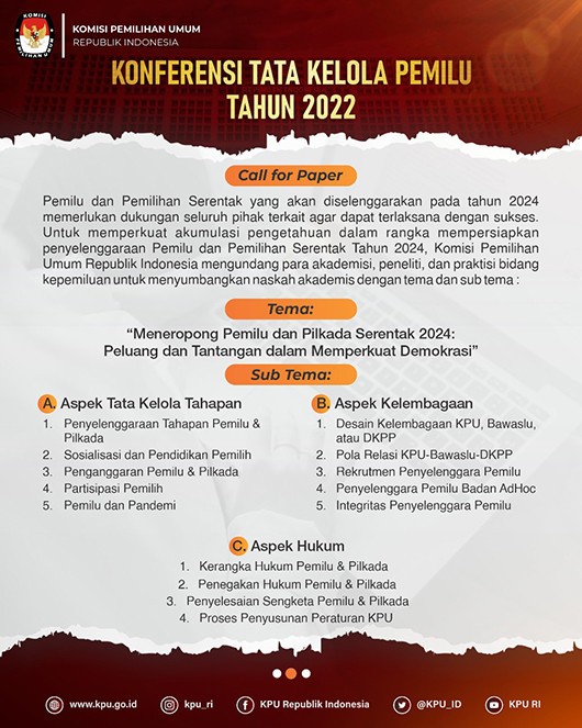 KPU RI telah mengumumkan di website KPU pada tanggal 4 Februari 2022 Call For Paper Konferensi Nasional Tata Kelola Pemilu Tahun 2022 yang mengangkat tema " Meneropong Pemilu dan Pilkada Serentak 2024 : Peluang dan Tantangan dalam Memperkuat Demokrasi ".