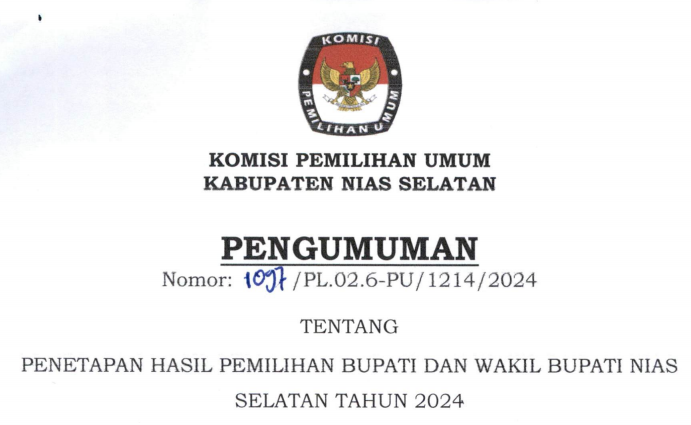 PENETAPAN HASIL PEMILIHAN BUPATI DAN WAKIL BUPATI NIAS SELATAN TAHUN 2024