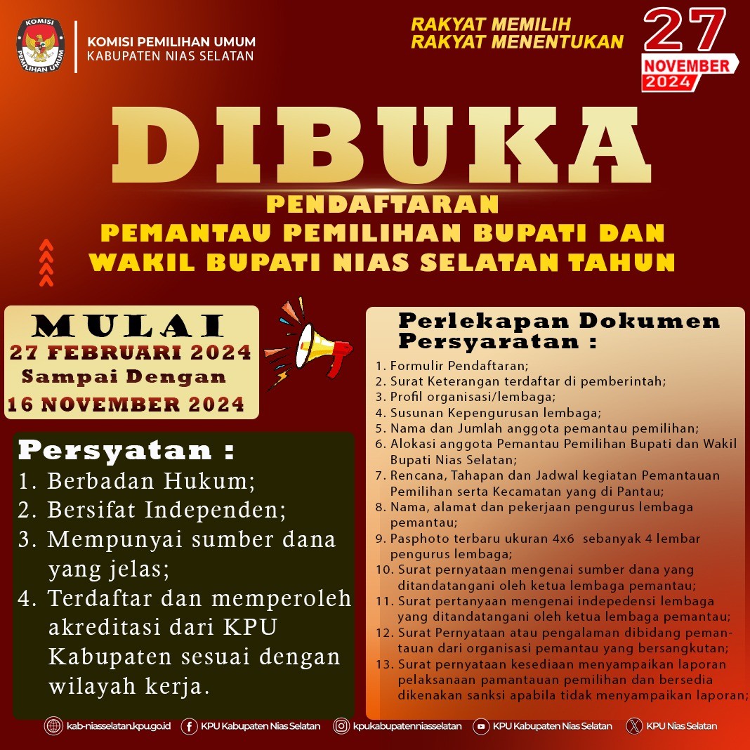 Senin, 25 Maret 2024, telah dibuka Pendaftaran Pemantau Pemilihan Bupati dan Wakil Bupati Nias Selatan