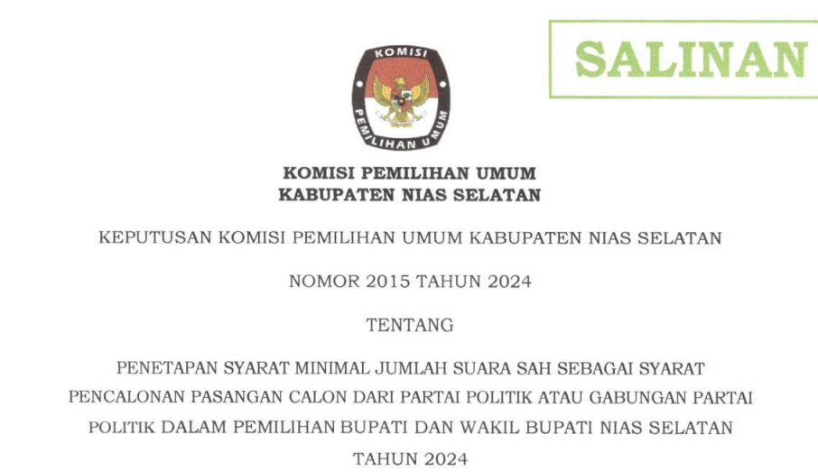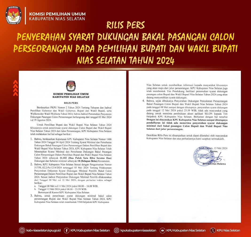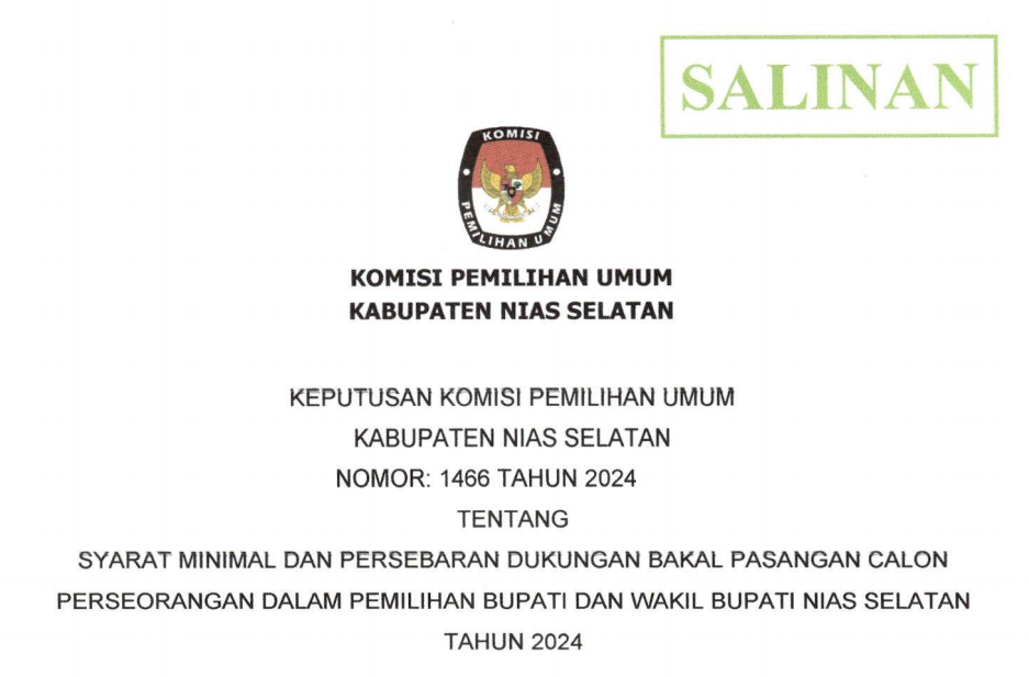 kab-niasselatan.kpu.go.id - Berdasarkan PKPU Nomor 2 Tahun 2024 Tentang Tahapan dan Jadwal Pemilihan Gubemur dan Wakil Gubemur, Bupati dan Wakil Bupati, serta Walikota dan Wakil Walikota Tahun 2024, bahwa Jadwal Pemenuhan Pesyataran Dukungan Pasangan Calon Perseorangan berlangsung dari tanggal 05 Mei 2024 s.d 19 Agustus 2024...selengkapnya >>> KLIK DISINI <<<