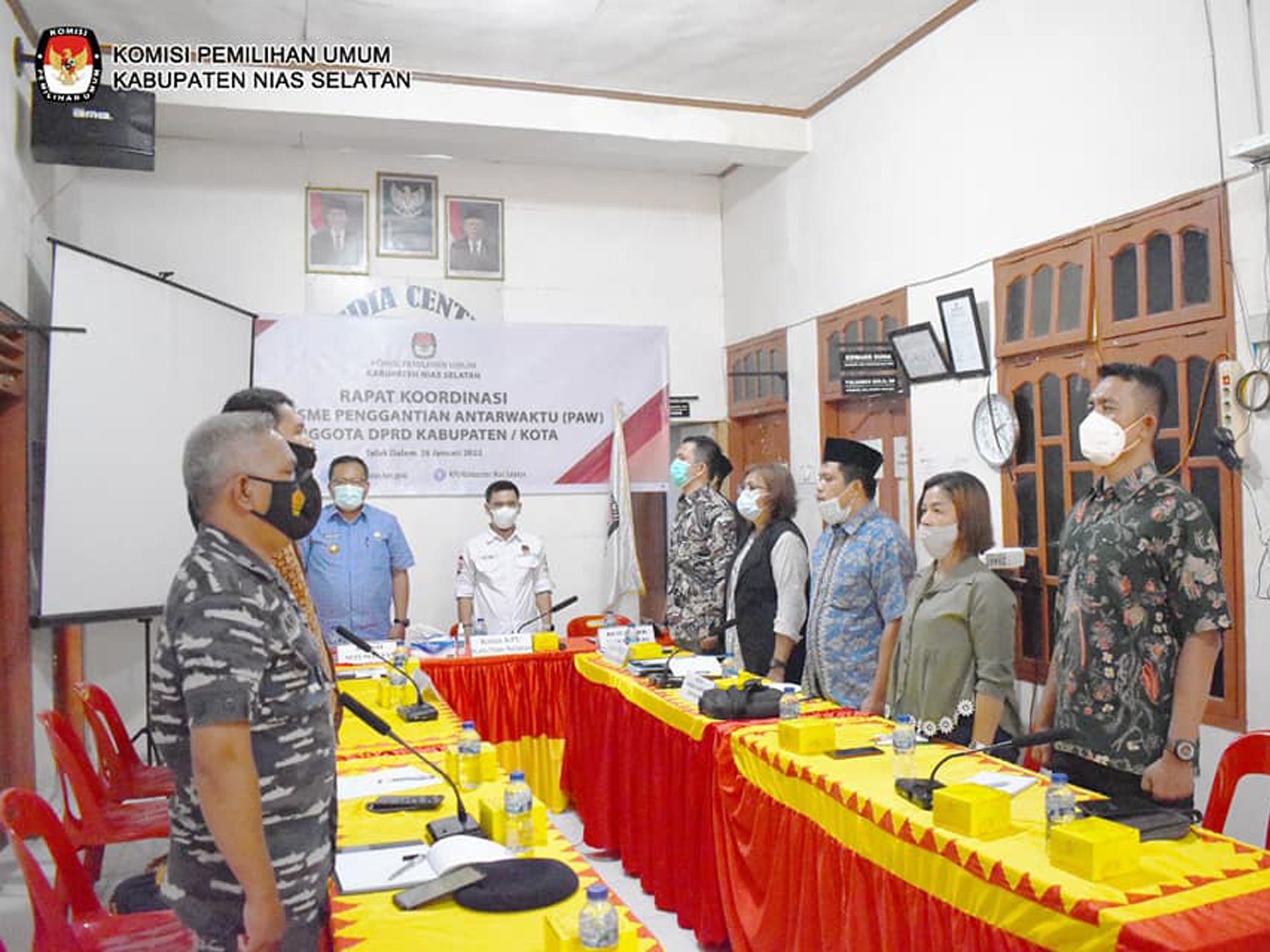 Pelaksanaan Rapat Koordinasi Mekanisme Penggantian AntarWaktu (PAW) Anggota DPRD Kabupaten/Kota berlangsung di Kantor KPU Kabupaten Nias Selatan pada Jumat, 28 Januari 2022.